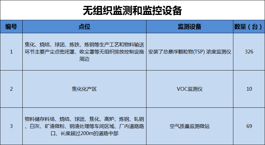 安豐鋼鐵分別安裝了326臺(tái)總懸浮顆粒物(TSP)濃度監(jiān)測(cè)儀,10臺(tái)VOC監(jiān)測(cè)儀,69臺(tái)空氣微站,實(shí)時(shí)監(jiān)測(cè)廠(chǎng)區(qū)的無(wú)組織排放情況,以便及時(shí)治理。